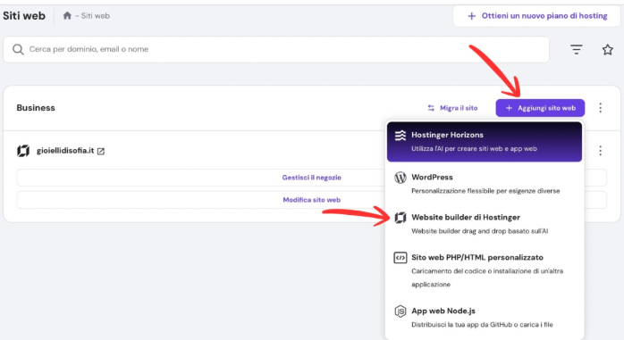 Offre anche piani di Hosting specifici per Woocommerce, il popolare plugin di ecommerce per WordPress, che include ottimizzazioni per siti di grandi dimensioni. Ma noi andremo ad utilizzare il costruttore di siti web di Hostinger.