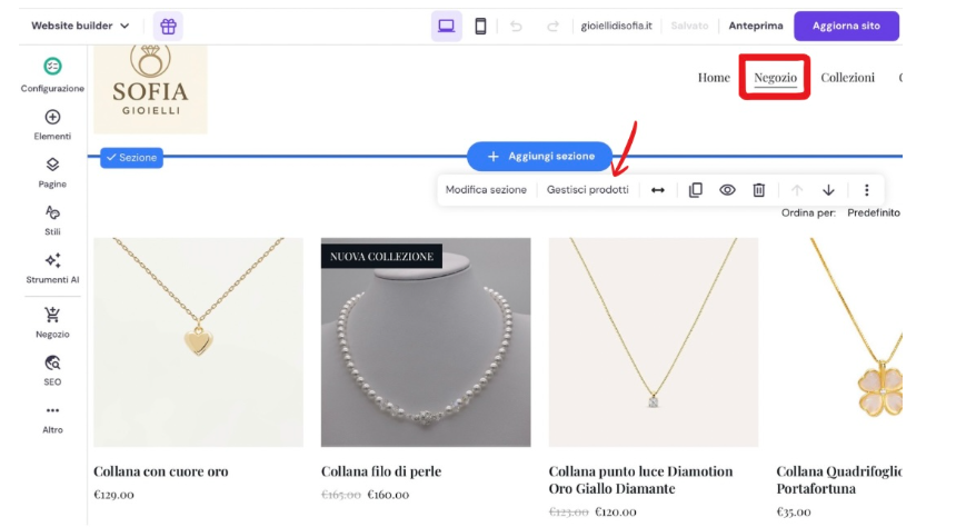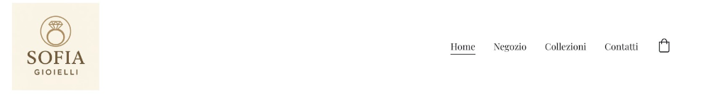 Sulla sinistra puoi inserire il logo. Sulla destra trovi la home page, il negozio, le collezioni, i contatti e il carrello. Ma puoi sia modificare i pulsanti, sia aggiungerne altri, ad esempio chi siamo. In base a ciò che ti interessa clicchi sulle diverse scritte. Se ti servono i contatti, clicchi su contatti.