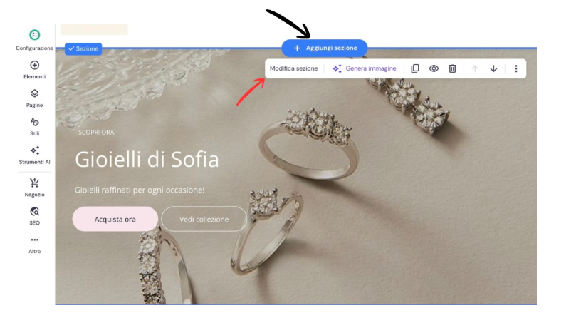 Il builder di siti web drag and drop garantisce flessibilità. Puoi inserire elementi a tuo piacimento senza essere limitati da un template rigido. Il website builder semplifica anche l’aggiunta di nuove sezioni al template di sito web. E’ sufficiente selezionare l’area desiderata e scegliere un layout vuoto o predefinito.