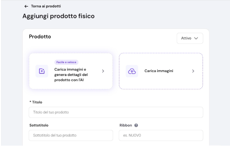 4 . Dopodiché carica le immagini del prodotto, con la possibilità di generare dettagli di esso con l’AI e inserisci il nome del prodotto
