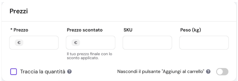 6 . Inserisci il prezzo, il prezzo scontato, il peso (non è obbligatorio), e la quantità (anch’essa non è obbligatoria)