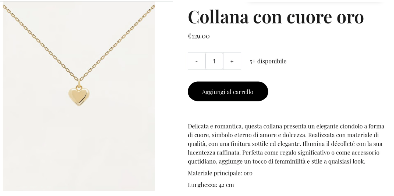 9 . Questo è il risultato. Cliccando su home, vuoi vedere i dettagli del prodotto, e questa è la schermata che si apre, con il titolo, la quantità, la descrizione, il materiale principale, la lunghezza e se c’è anche il prezzo scontato.